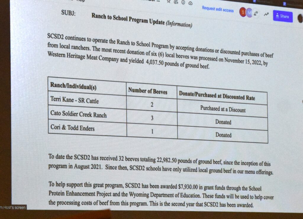 Leslie Haberkern talked about the Ranch to Table program, and the local beef they have received for the school lunch program. She said they have received four donations and two that were purchased at a discount. They have been processed and yielded over 4,000 lbs of hamburger. Since August, 2021, SCSD#2 has only used local beef for the school lunch program.
