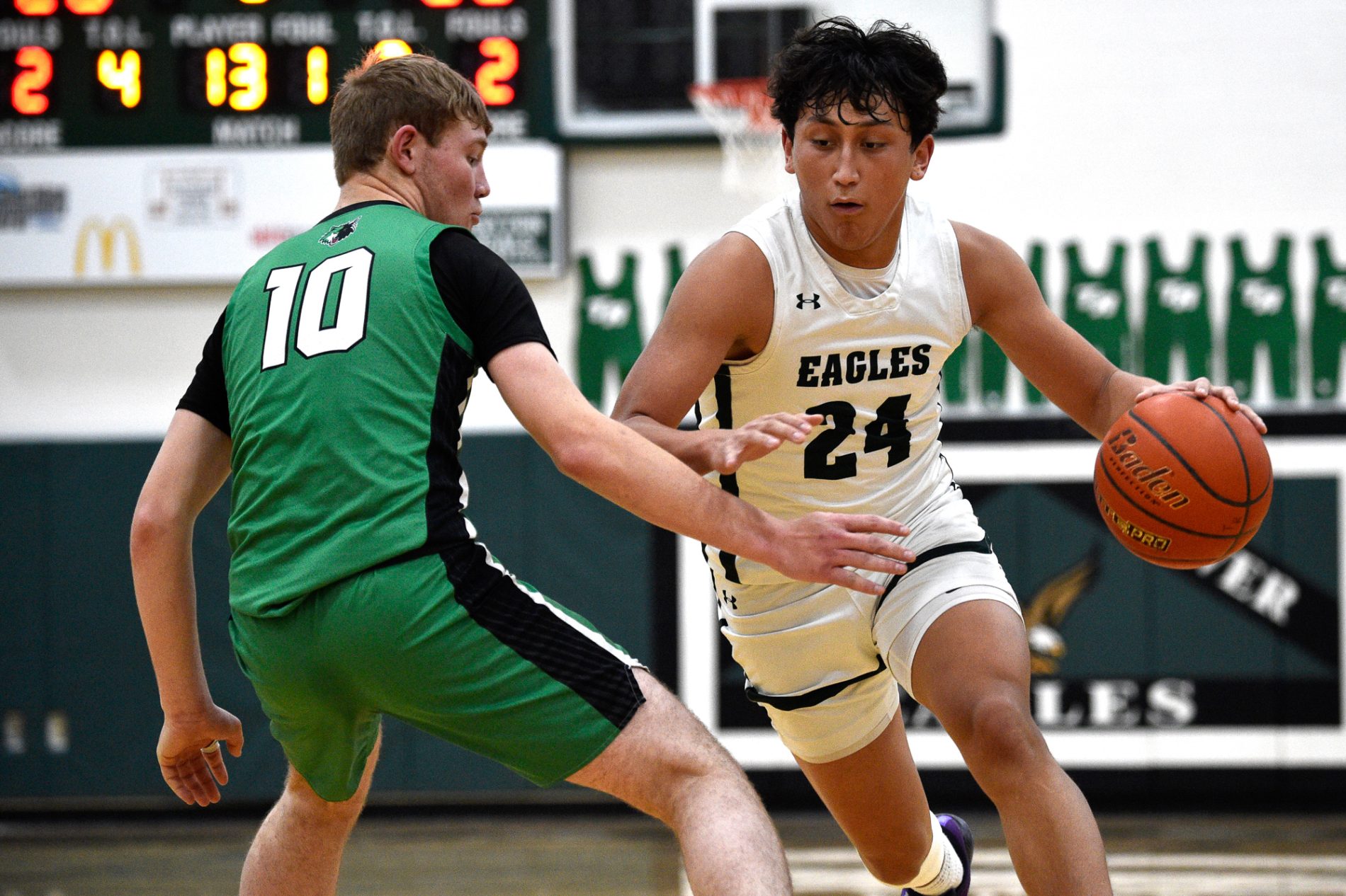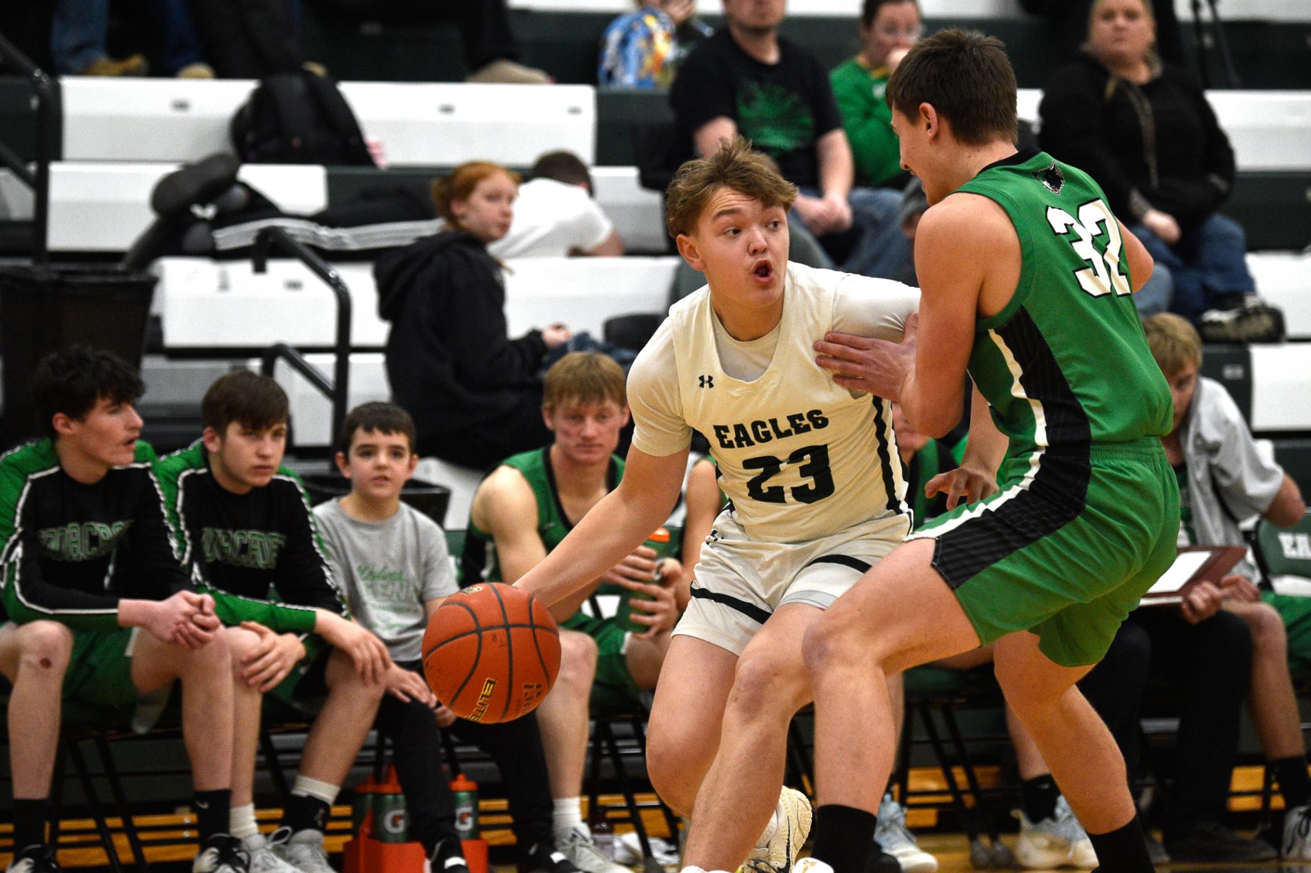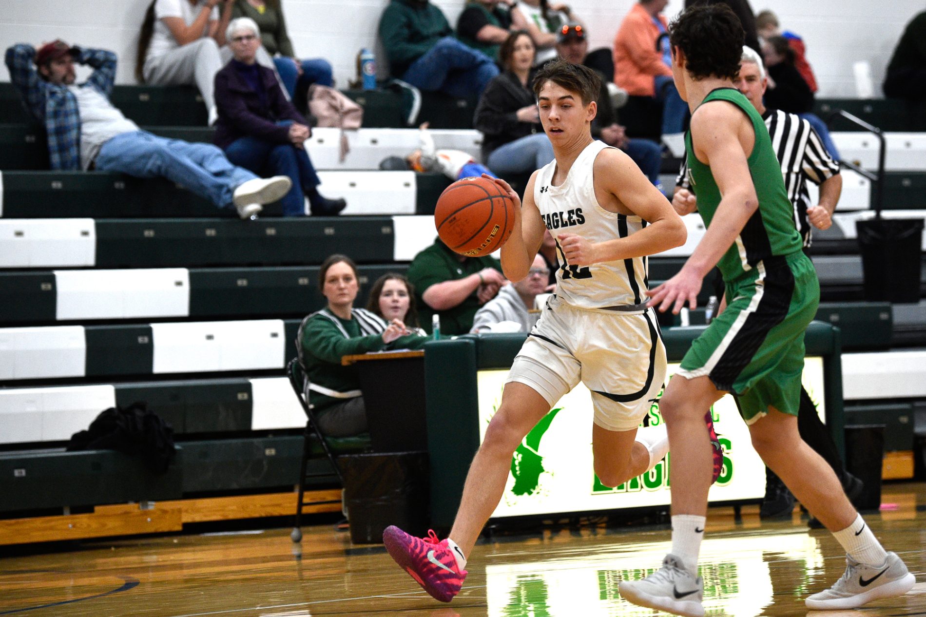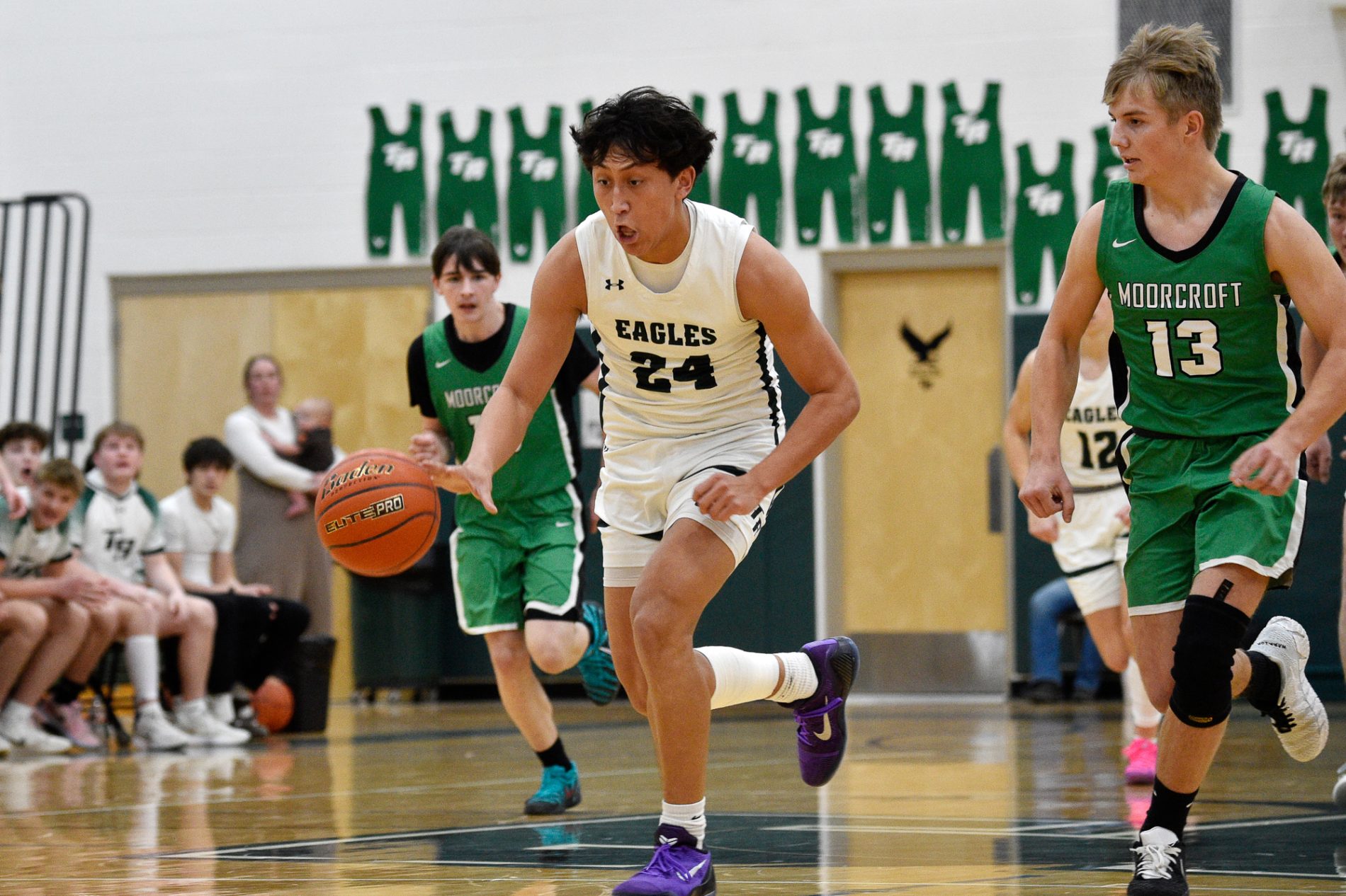Tongue River Eagles' junior Kenyonn Snell is one step ahead of Moorcroft Wolves' Laiden Huckins as he pushes the ball up the court in their game at Dayton Friday, Jan. 30, 2026. The Eagles lost 63-57. Snell drained a three-pointer for the Eagles' final points.