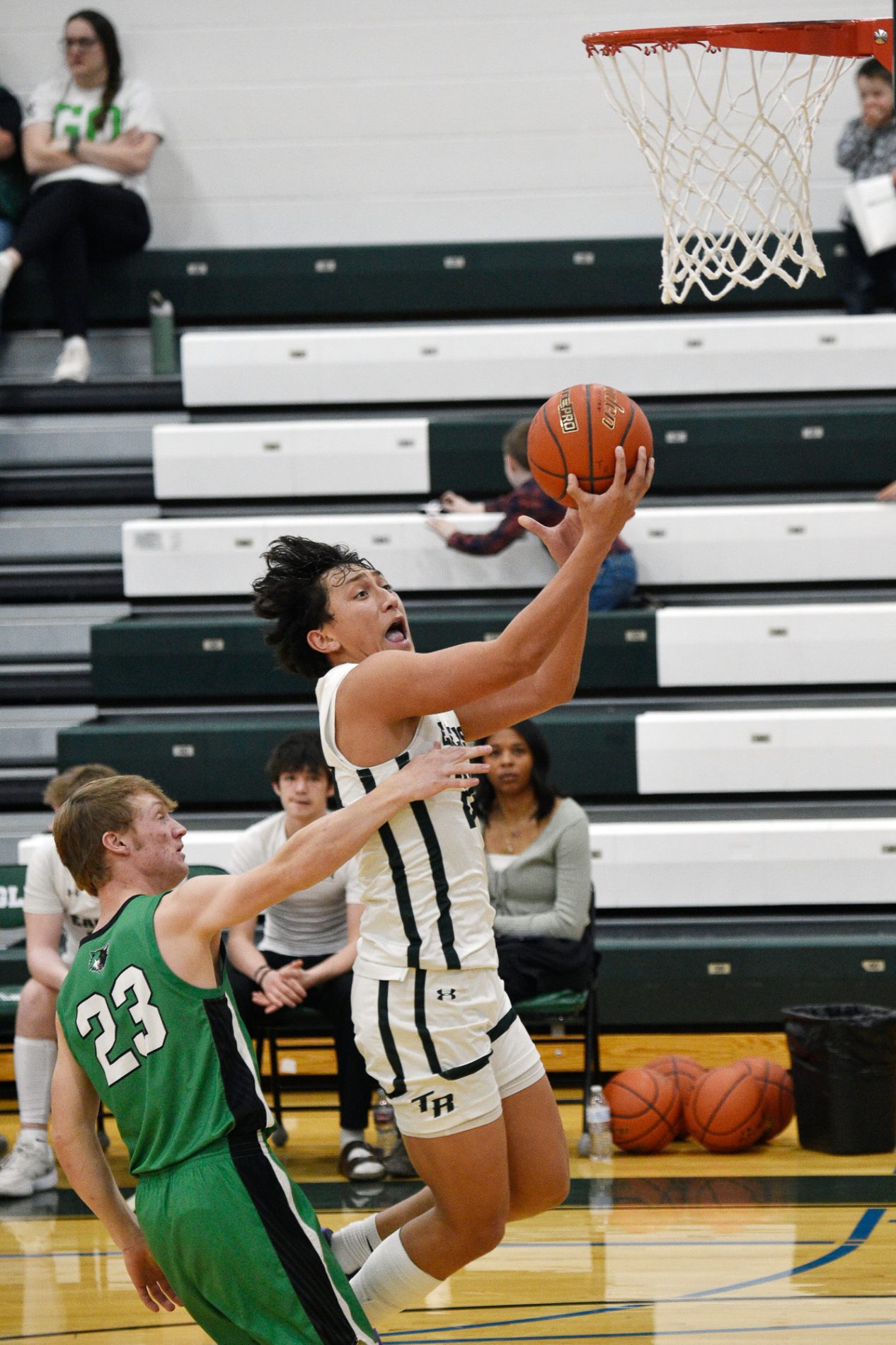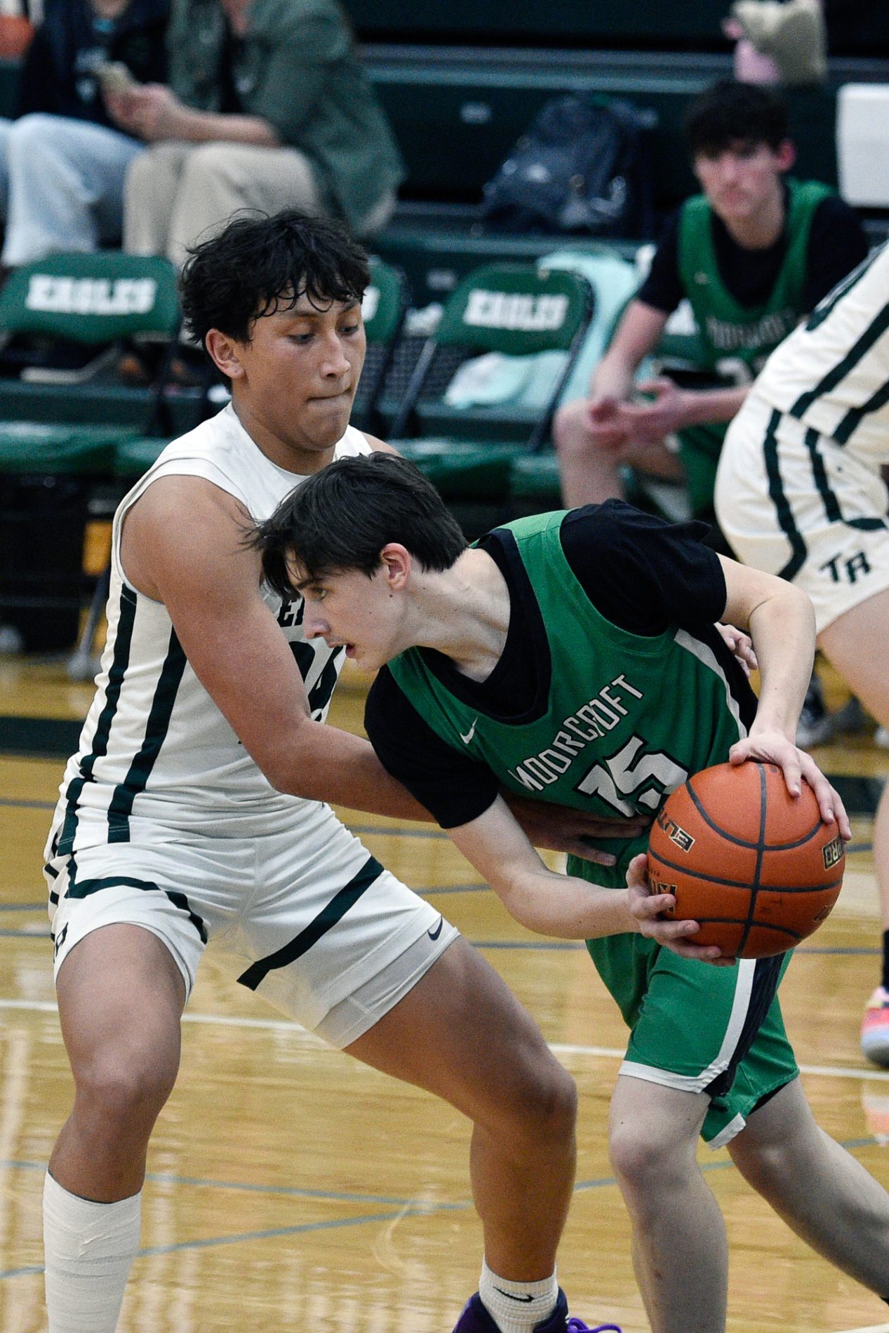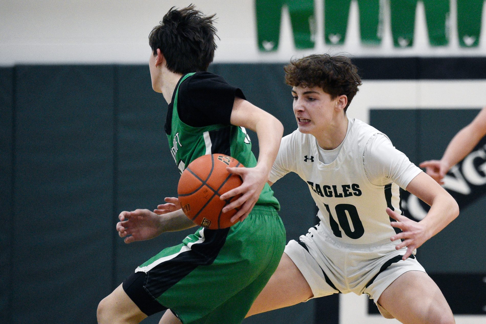 Tongue River Eagles' junior Kenyonn Snell is one step ahead of Moorcroft Wolves' Laiden Huckins as he pushes the ball up the court in their game at Dayton Friday, Jan. 30, 2026. The Eagles lost 63-57. Snell drained a three-pointer for the Eagles' final points.
