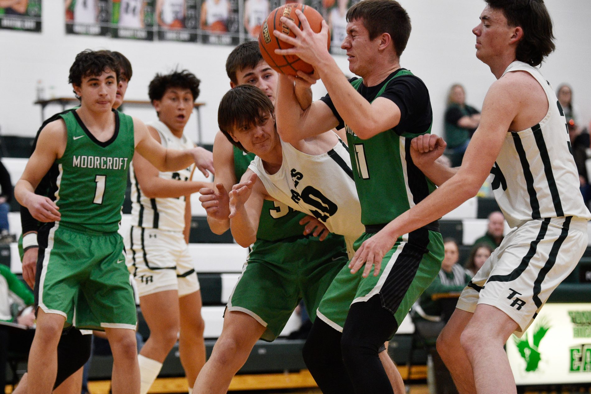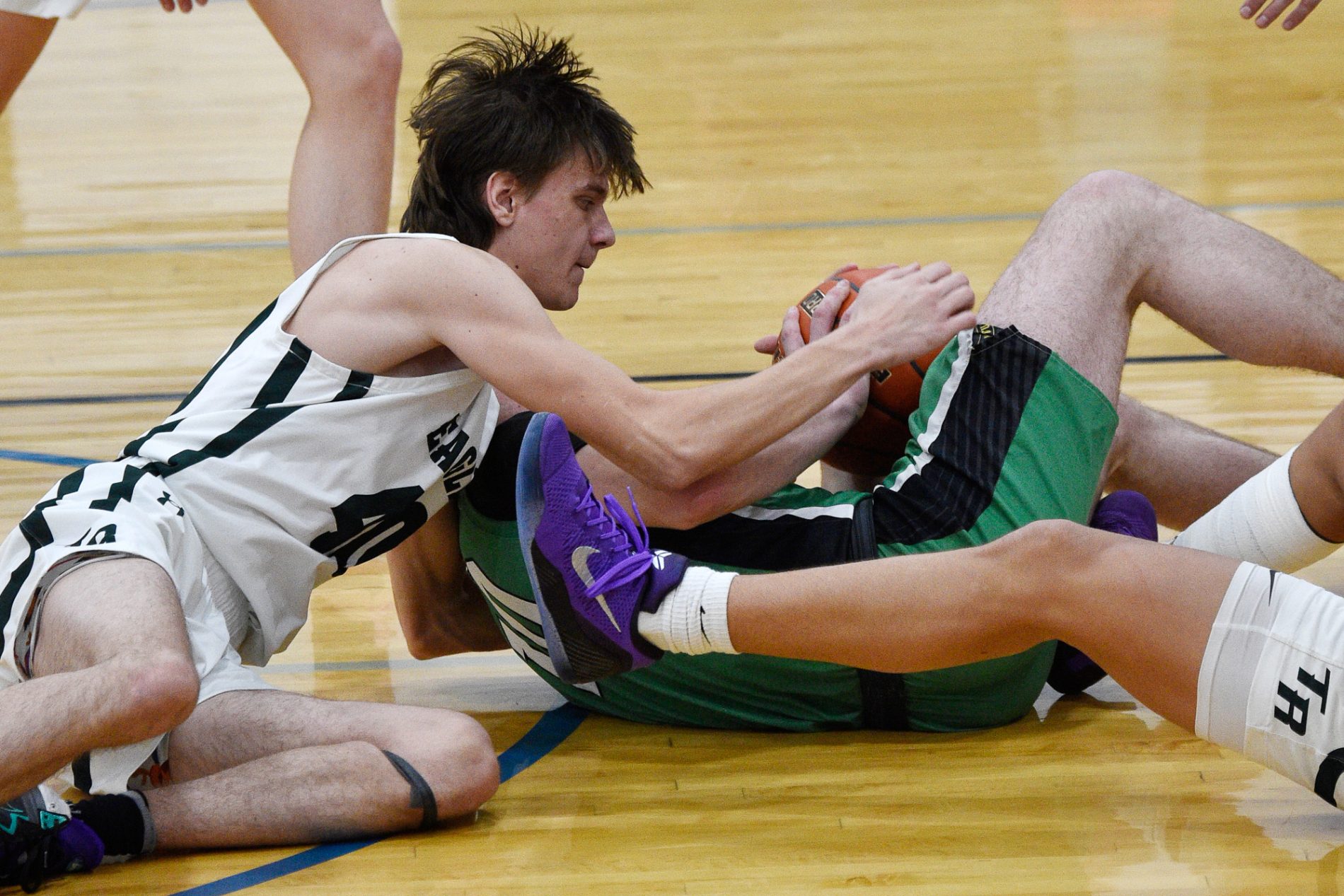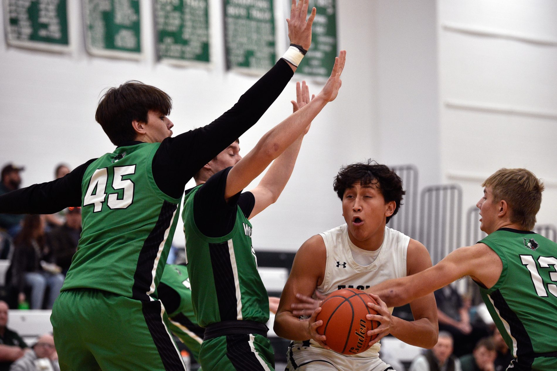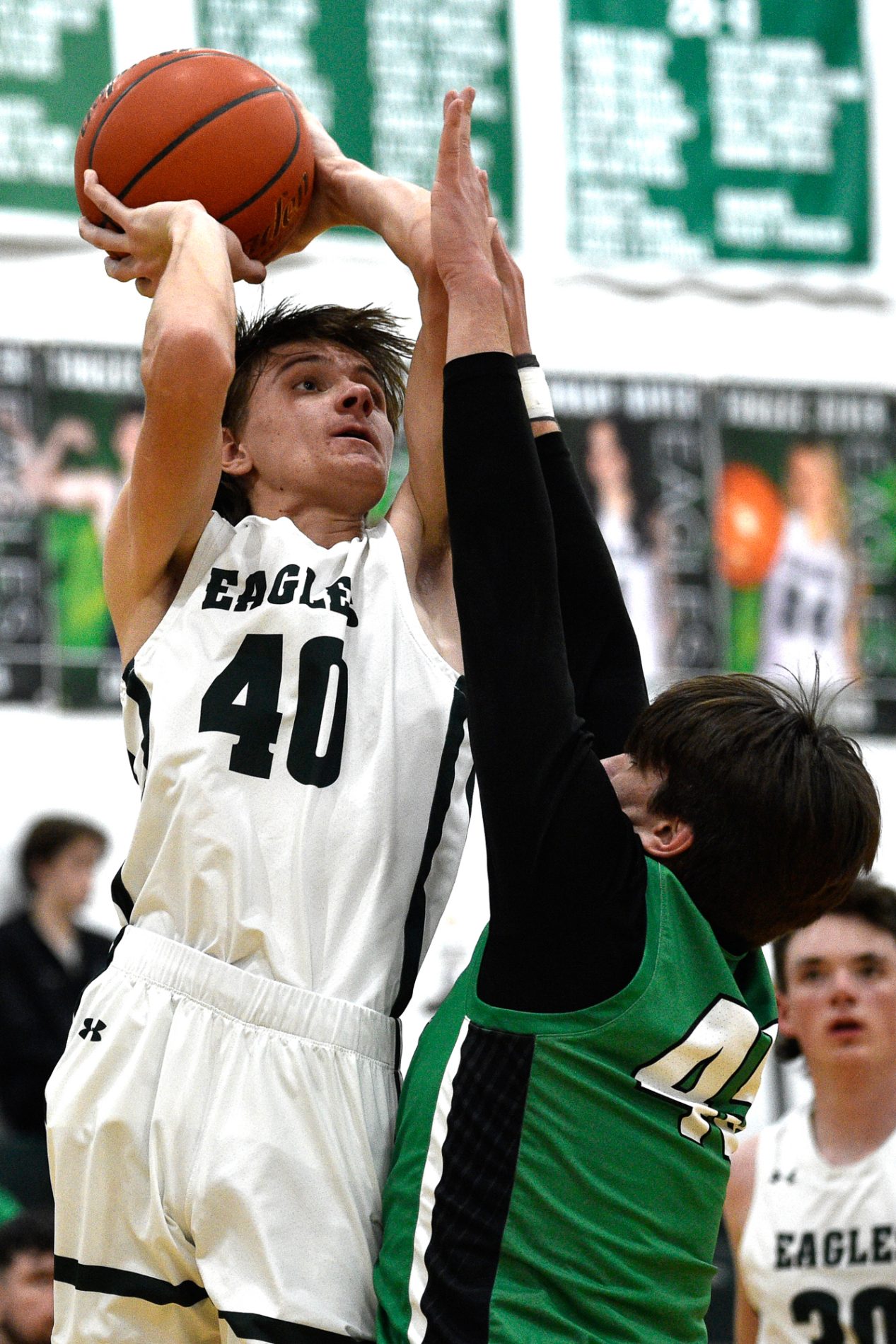 Tongue River Eagles' junior Kenyonn Snell is one step ahead of Moorcroft Wolves' Laiden Huckins as he pushes the ball up the court in their game at Dayton Friday, Jan. 30, 2026. The Eagles lost 63-57. Snell drained a three-pointer for the Eagles' final points.
