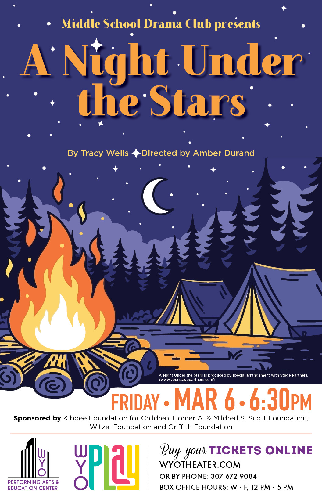 Featuring WYO PLAY Middle School Drama Club members Alma Gamblin, Sanibel Kerns, Alaina Schaefer, Elizabeth Peterson, Paisley Scott, Cassidy Warner, Tina Ross, Josephine Doney, Breklyn Curtis, Dreya Curtis and Sophia Sheffield, “A Night Under the Stars” is produced through an arrangement with Stage Partners.
