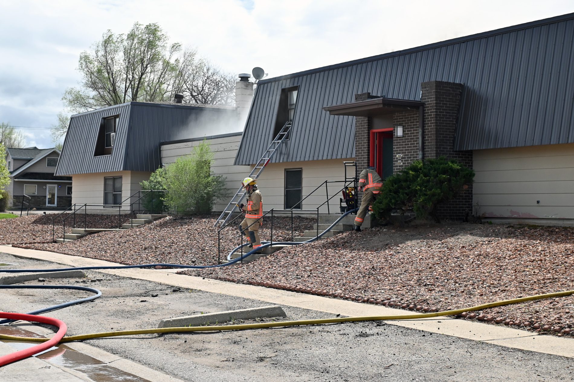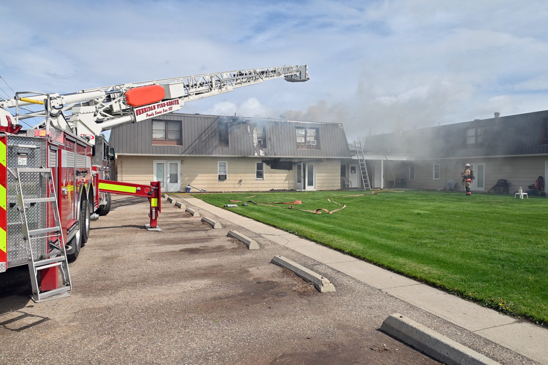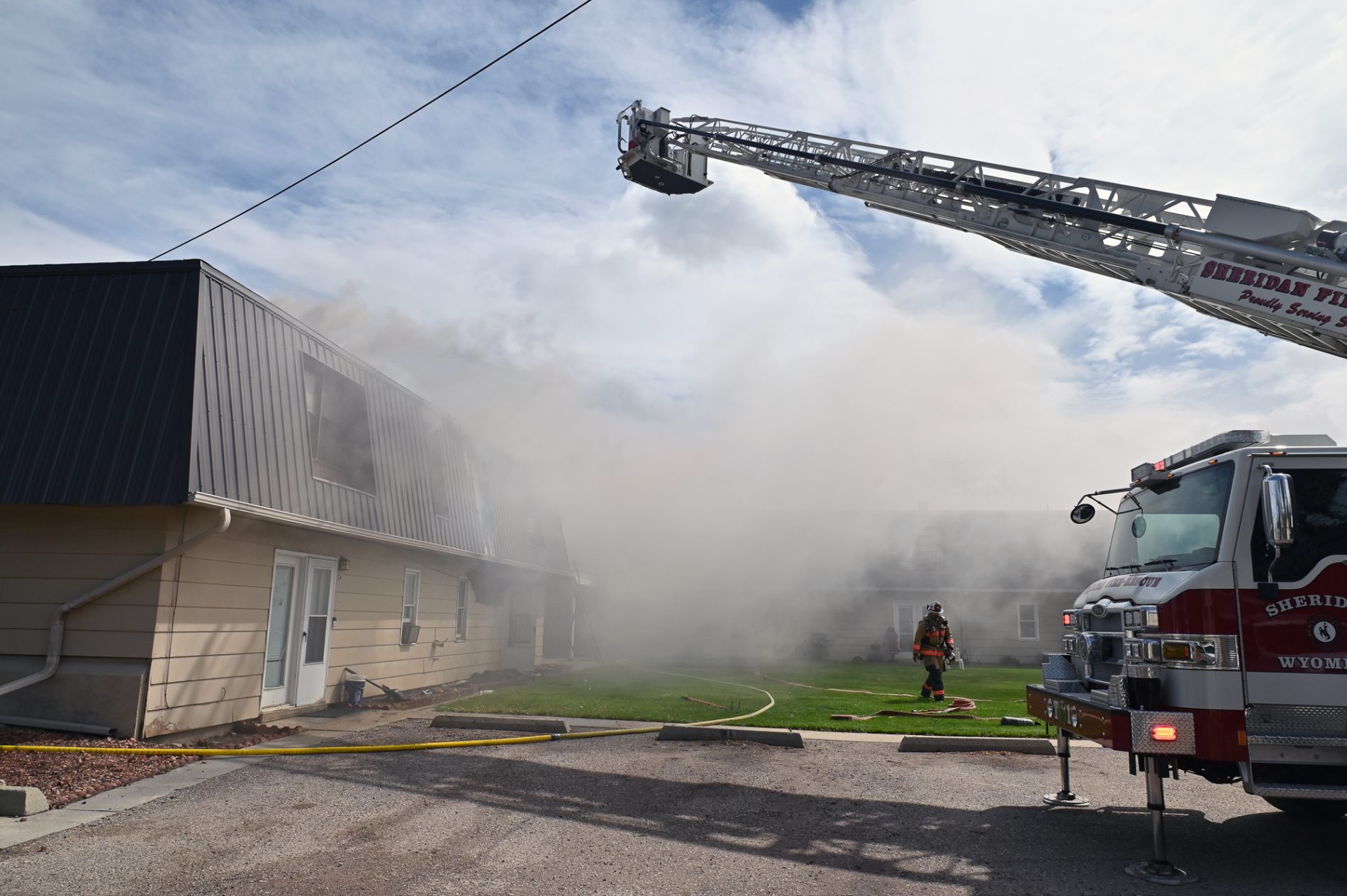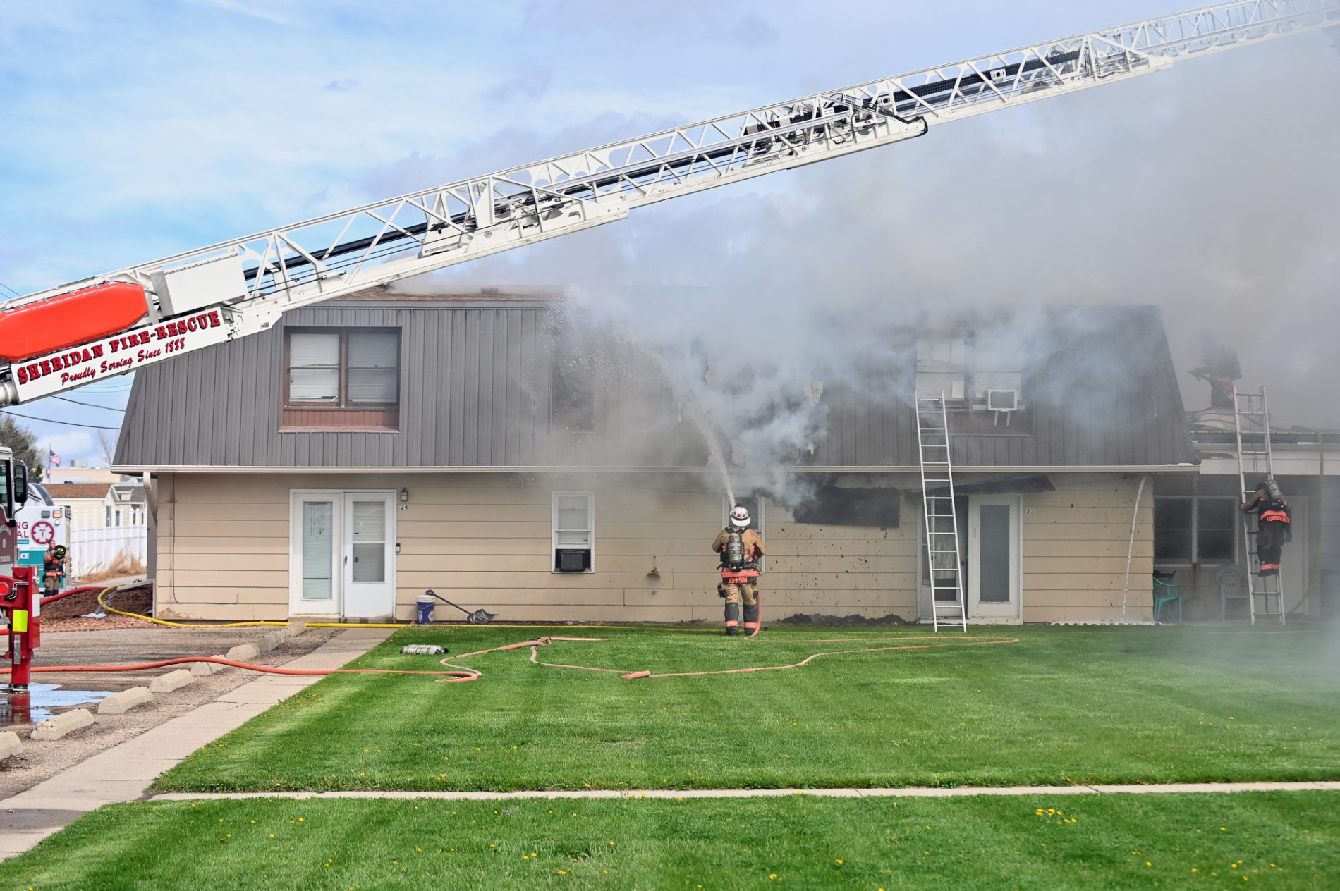 Sheridan-Fire Rescue and Goose Valley firefighters teamed up to knock down a structure fire the Hillside Manor apartment complex at the intersection of 11th Street and North Main Street Thursday, April 23, 2026. The SF-R Tower truck was also dispatched. The winds hindered fighting the fire. One person was attended at the scene.