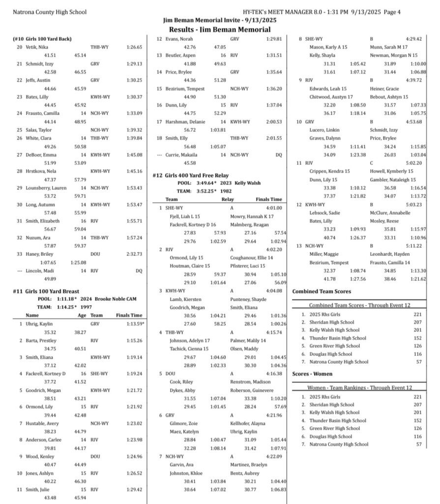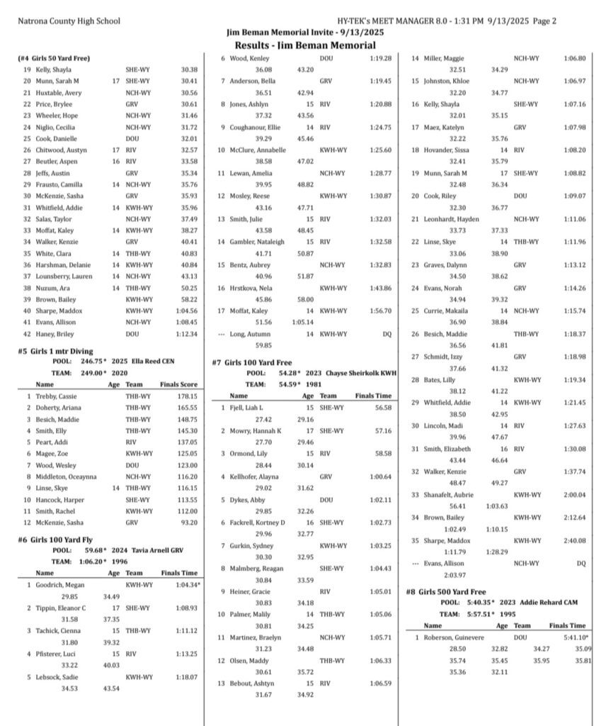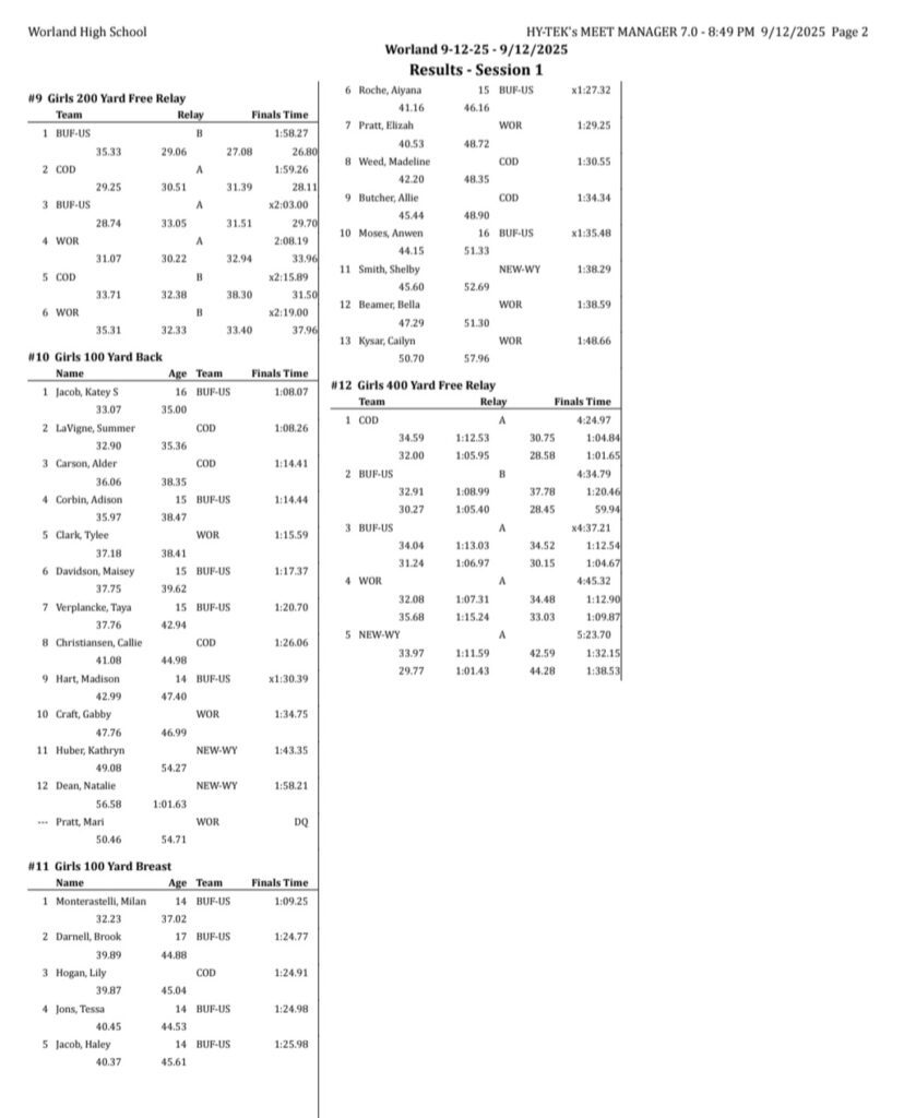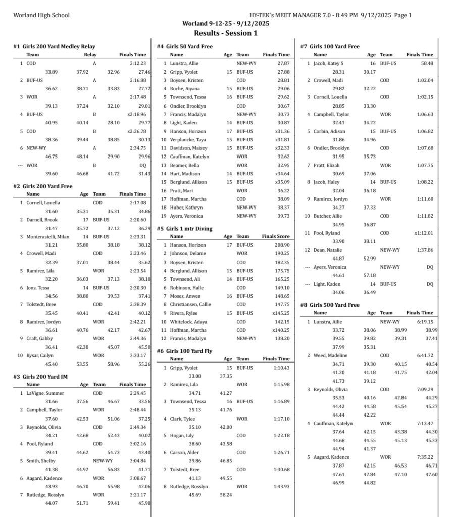 Sheridan/Buffalo HS Girls Swimming And Diving Results: September 12-13, 2025