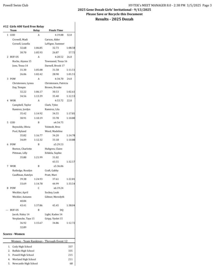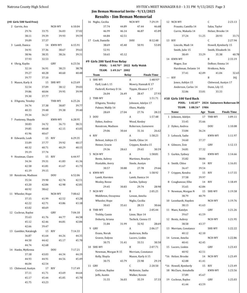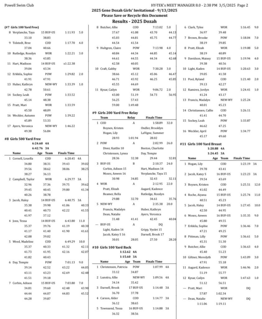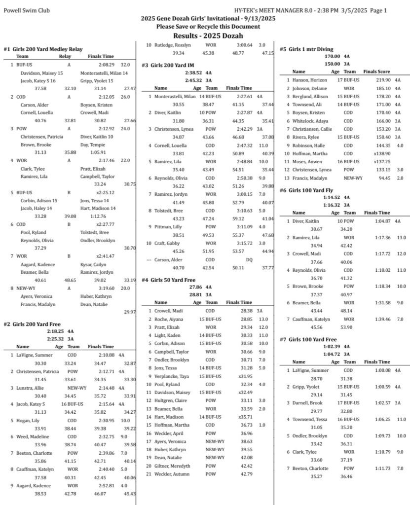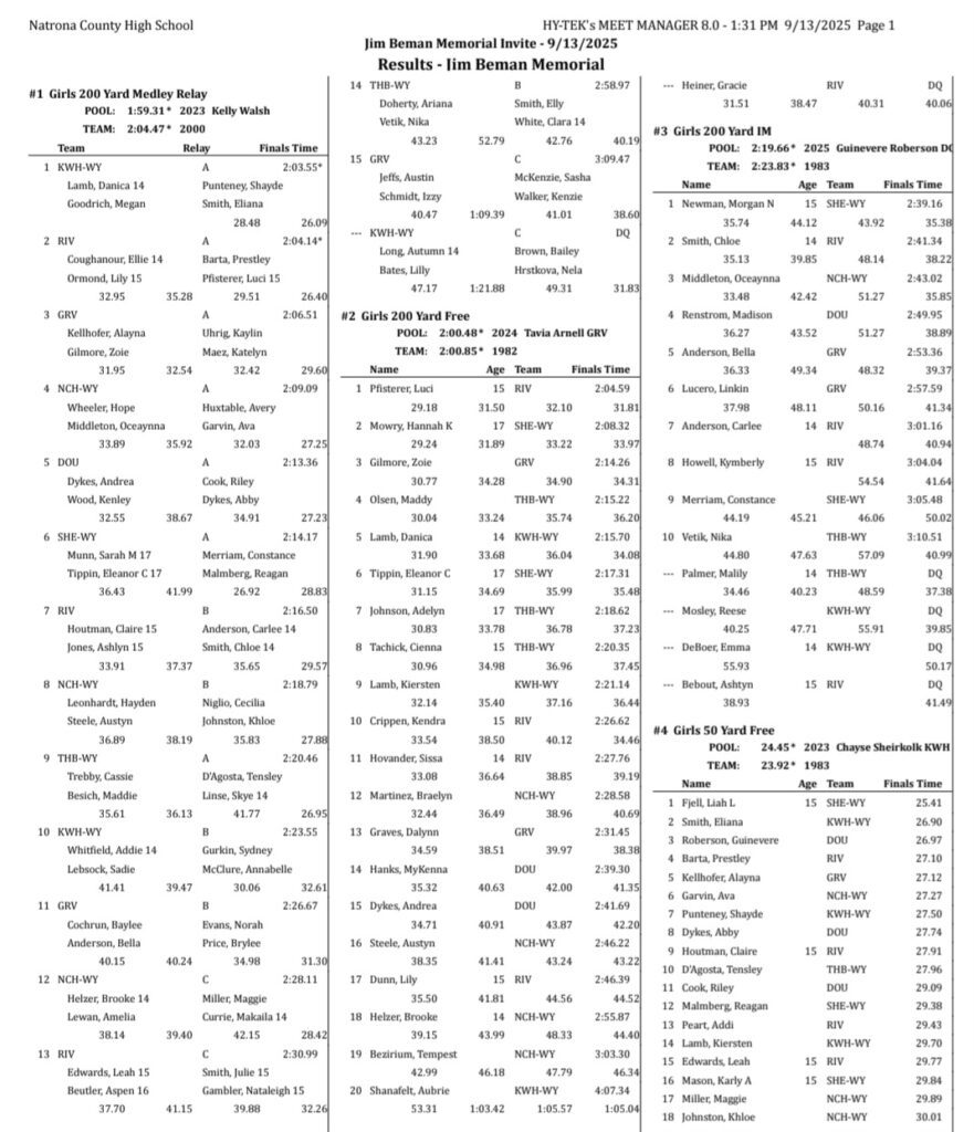 Sheridan/Buffalo HS Girls Swimming And Diving Results: September 12-13, 2025