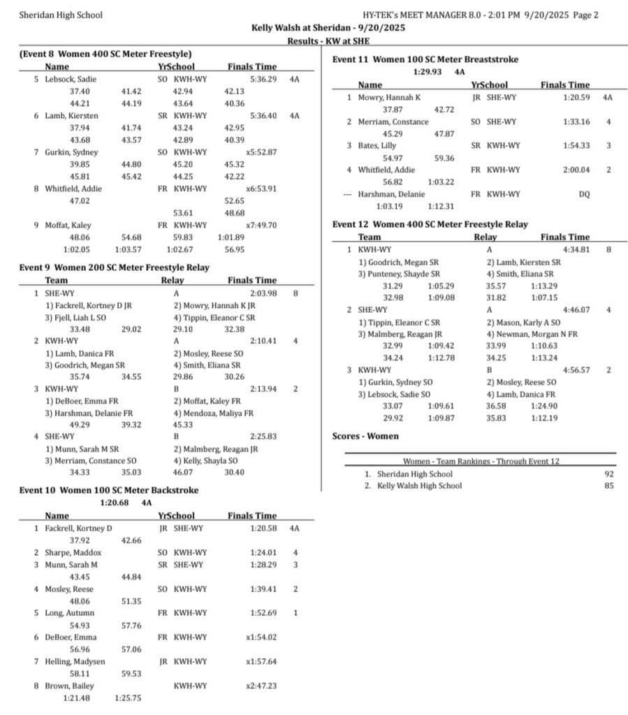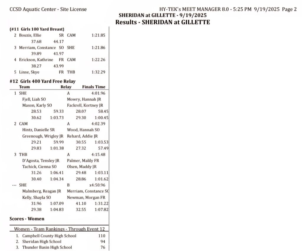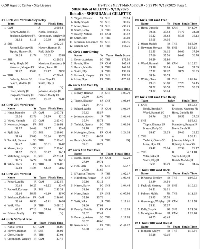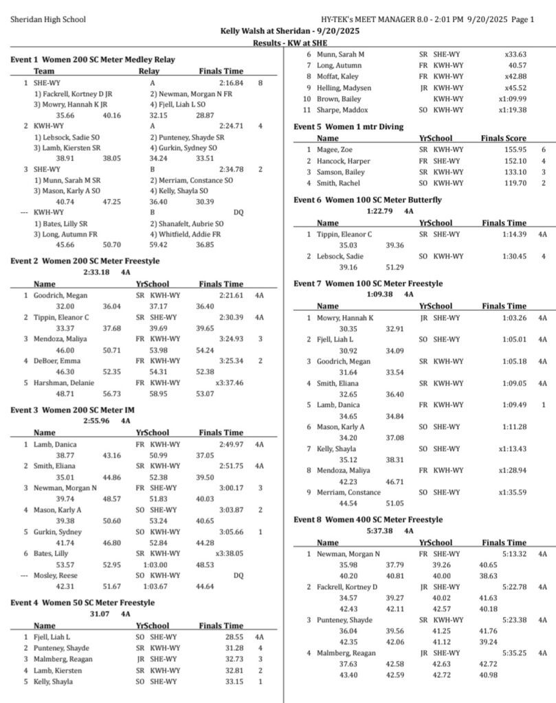 Sheridan/Buffalo HS Girls Swimming Results: September 19-20, 2025