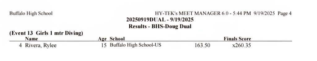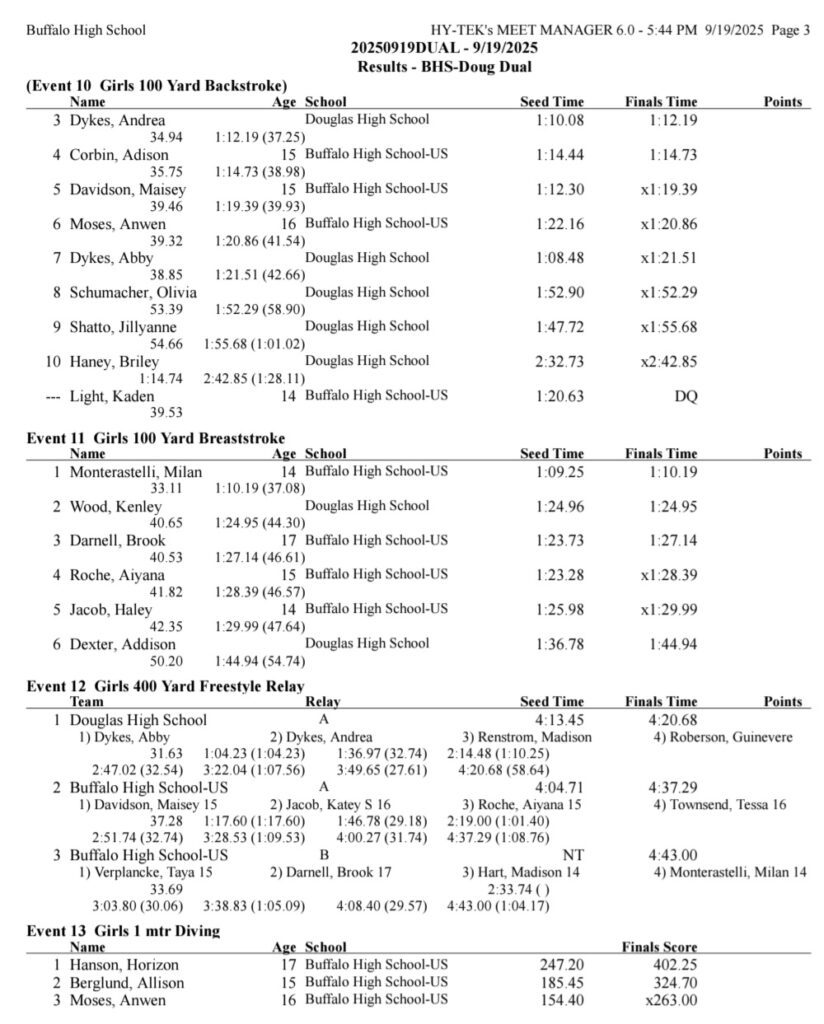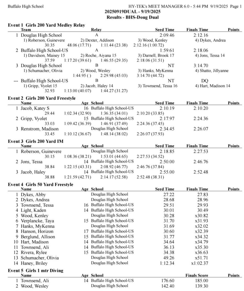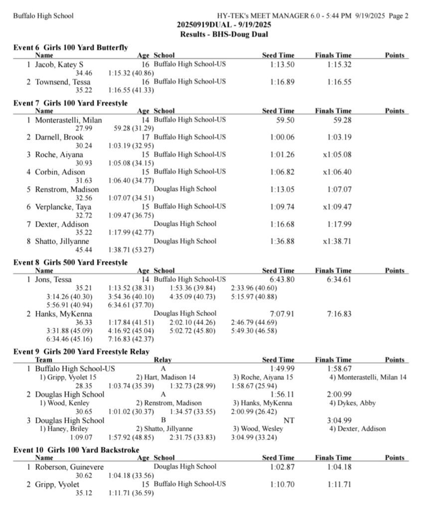 Sheridan/Buffalo HS Girls Swimming Results: September 19-20, 2025