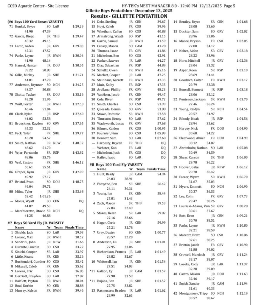 Sheridan/Buffalo HS Boys Swimming and Diving Results: December 12-13, 2025