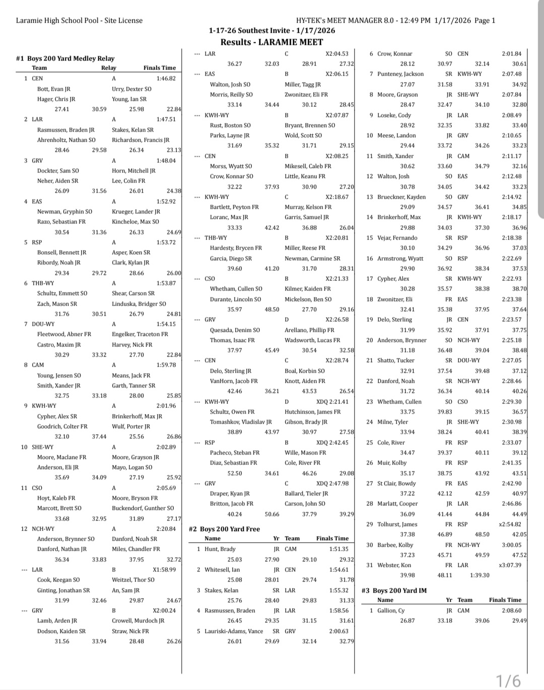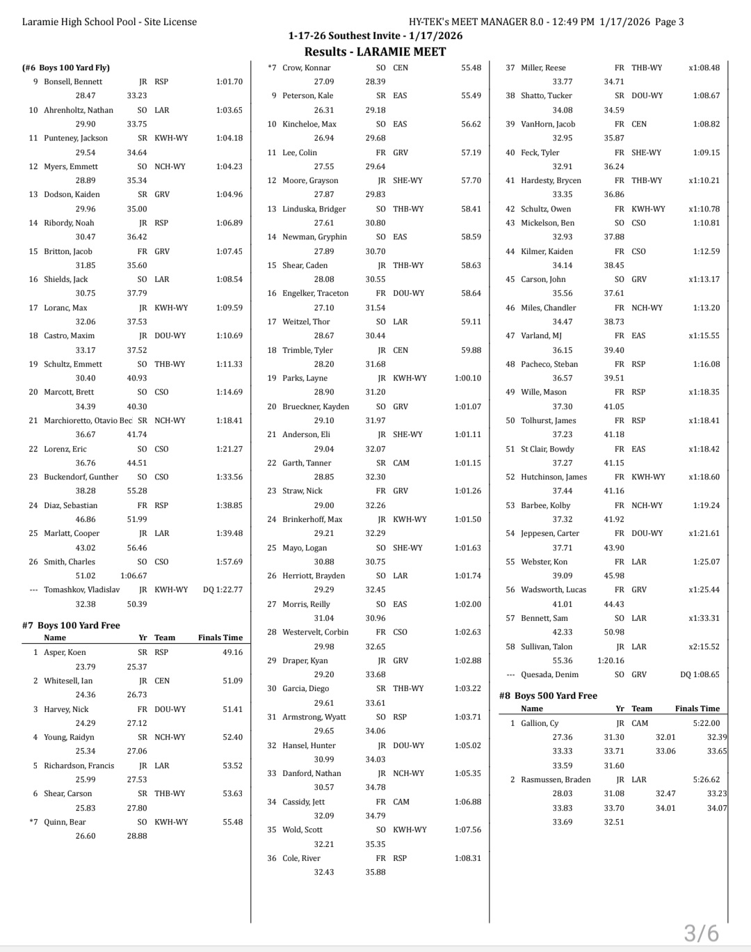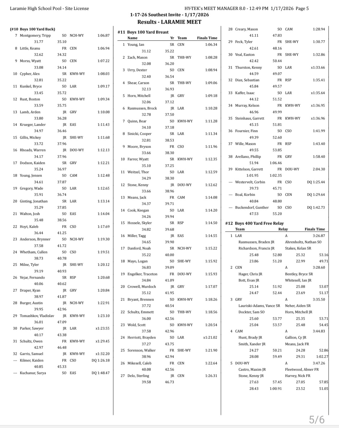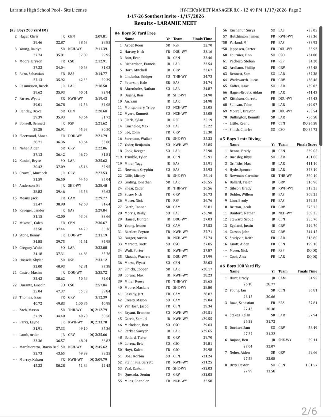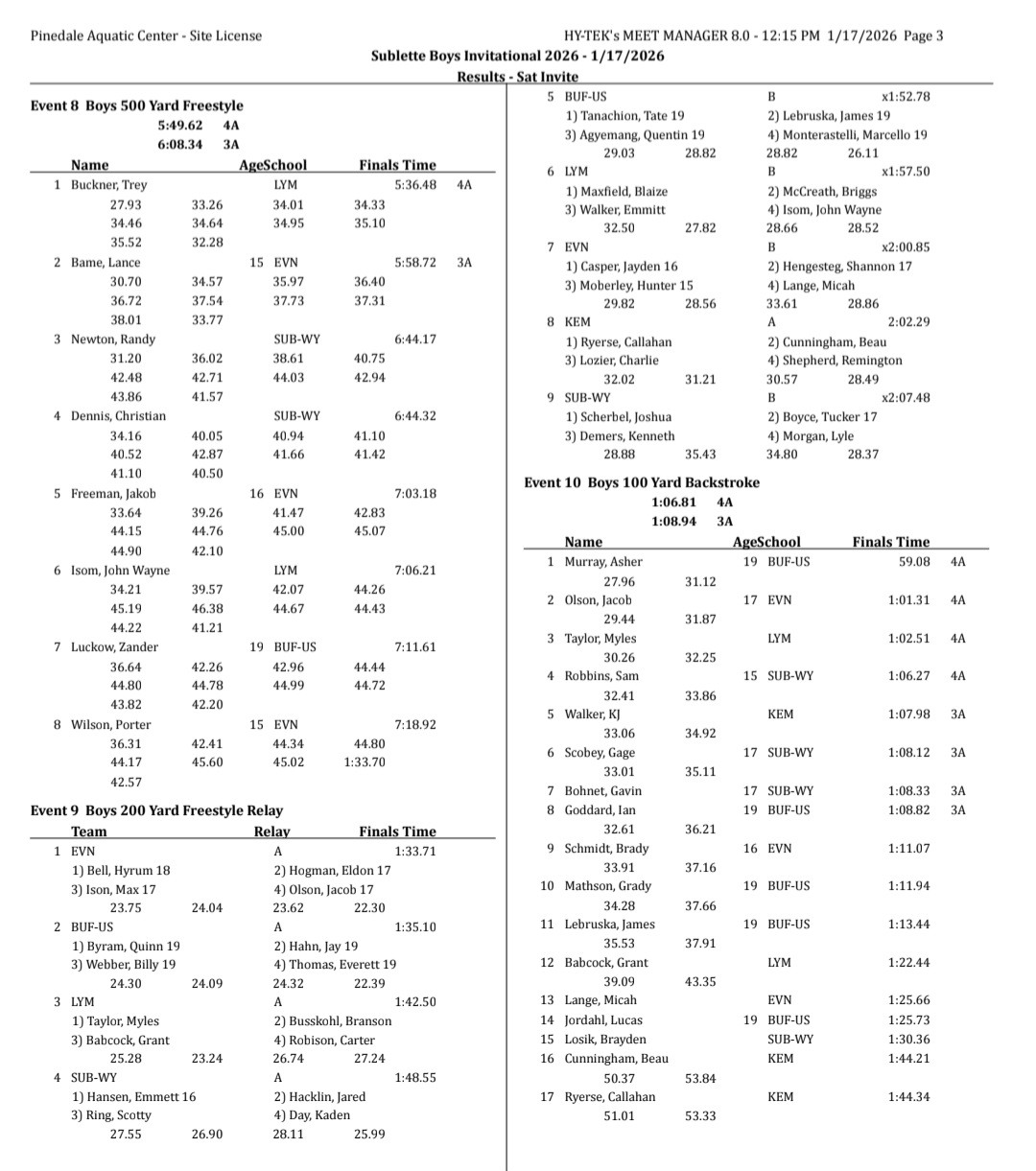 Sheridan/Buffalo HS Boys Swimming and Diving Results: January 16-17, 2026