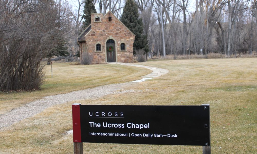 When driving east from Sheridan, along US Highway 14 East, just before one gets to the Ucross Y, there is a small stone chapel set back...